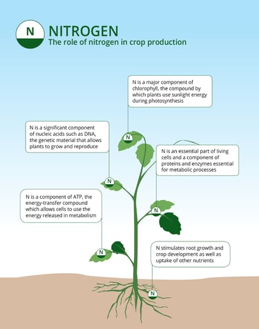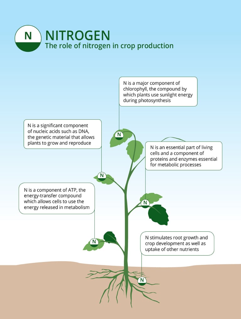 Nitrogen is an important component of many essential structural, genetic, and metabolic compounds in plant cells. It is also an elementary constituent of numerous important organic compounds including amino acids, proteins, nucleic acids, enzymes, and the chlorophyll molecule. It is clear to see why it is essential to ensure crops have access to sufficient nitrogen.