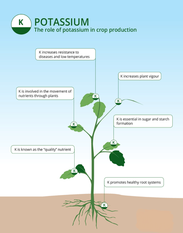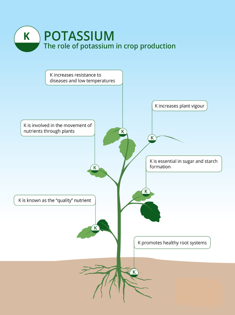 Potassium is essential for overall health, productivity, and quality of plants! From protein synthesis to flower and fruit development, potassium (or lack of) significantly influences crop yield and quality. By helping develop strong and healthy root systems, potassium also increases the efficiency of the uptake and use of nitrogen and other nutrients.